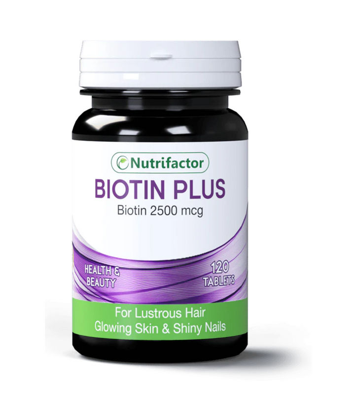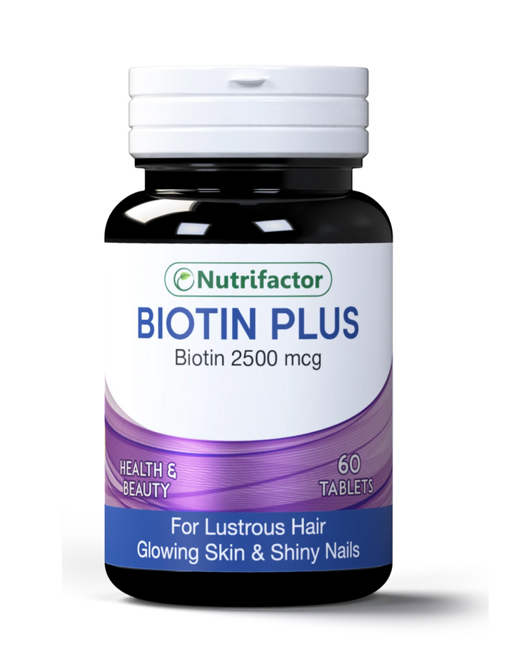 Nutrifactor Biotin Plus is a dietary supplement formulated with a combination of Biotin and Folic Acid (Vitamin B9), which are essential B vitamins known for their role in promoting hair, skin, and nail health. The 30-tablet pack offers a convenient, daily dose for those looking to address issues like hair fall, brittle nails, and dull skin.
